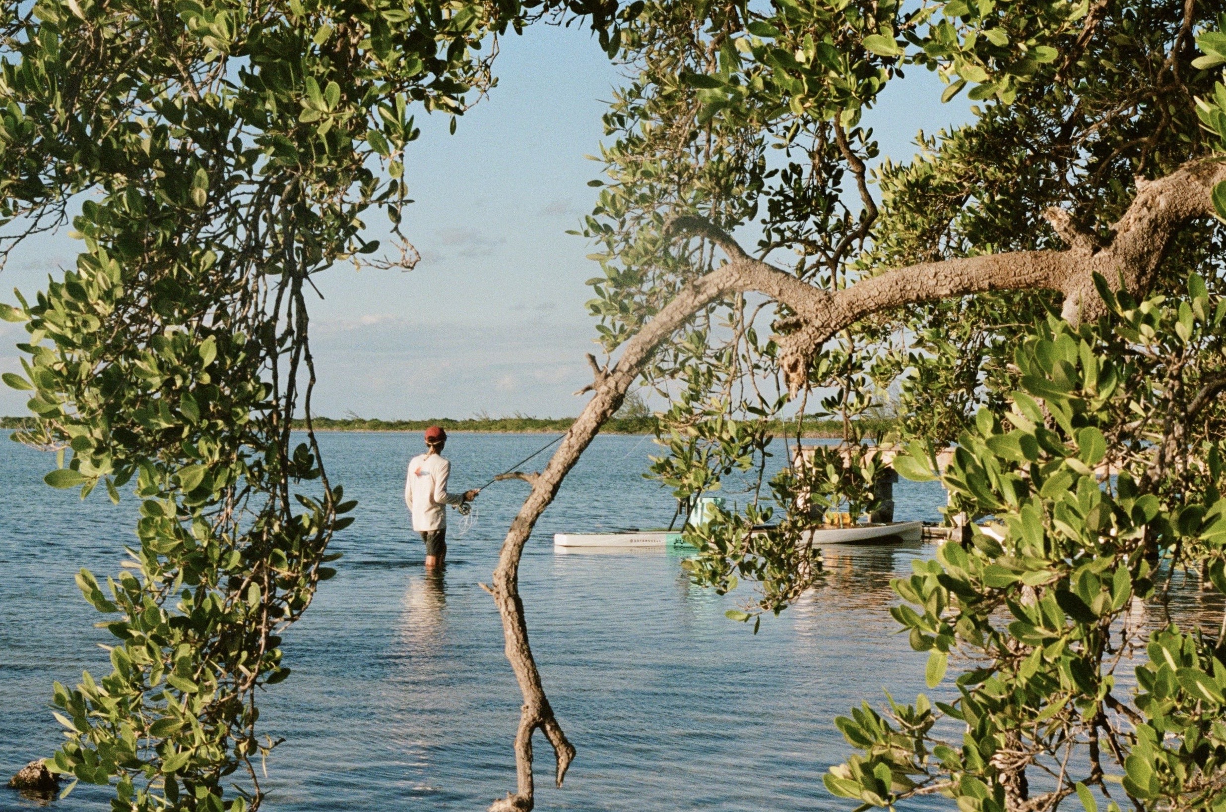 Pulling up to the camp is special. A mangrove channel suddenly opens up to a small bay, where you get your first glimpse of the blue house and cabanas surrounded by those palm trees. It would be easy to miss if you didn’t know where to look. At the end of the camp’s dock was a colorful mailbox with a tarpon painted on it. We were greeted by a pack of tail wagging dogs, and a Belizian man named Andreas, who tied our boat to the dock and took our fly rods.
